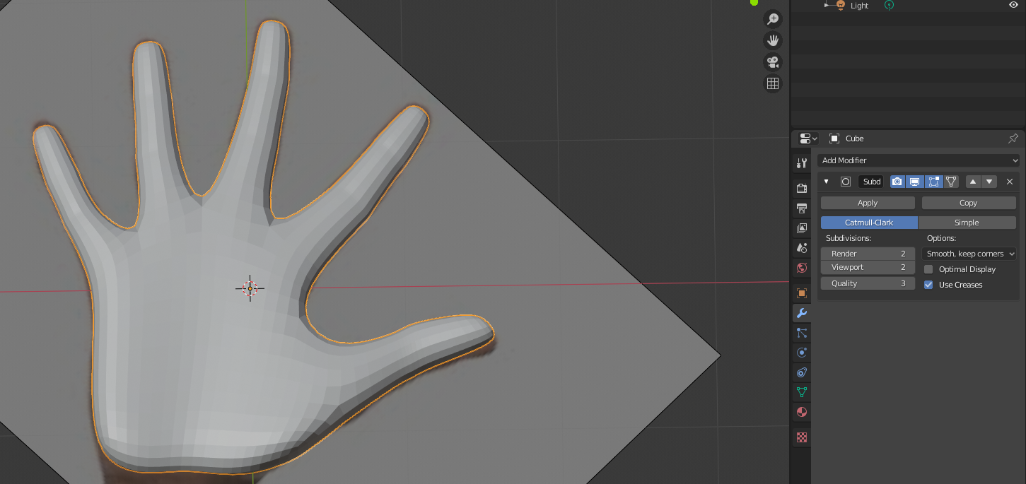 We need to add a little more geometry to everything. Select the knuckle edge loops and Bevel them. Using the Knife tool (on Cut Through mode), add two lines across the palm. Delete the face between the thumb and pointer finger, then create new faces with the Fill tool (F). Finesse everything again, along all 3 axes. It’s still going to look boxy, but we are about to fix that.