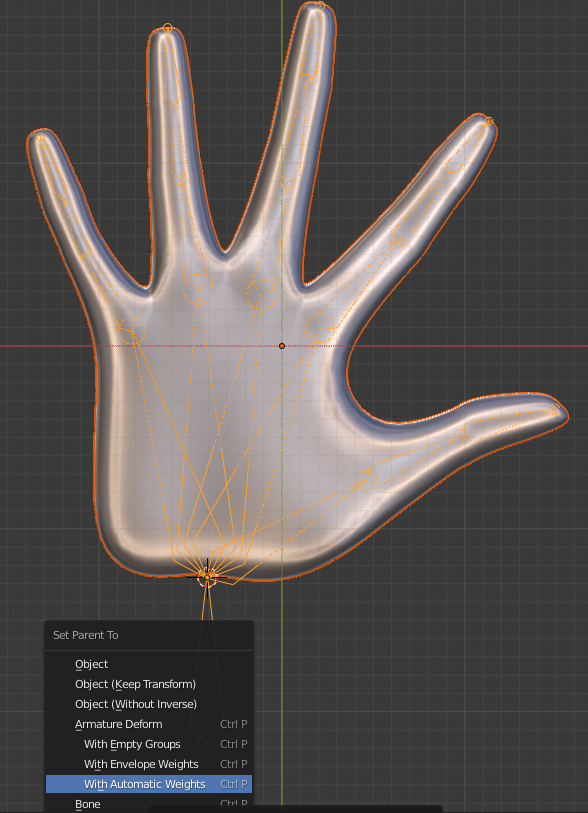Now, let’s make the hand do something interesting. Move the 3D cursor to the base of the hand (Shift+Right Click). Add an Armature. Move the root bone so that it is entirely outside of the hand. Extrude (E) the rest of the bones, lining them up as best you can to hand joints. Exit Edit Mode, select the hand, Shift+select the armature, and press Ctrl+P to set the hand’s parent to the armature. Select Add Automatic Weights.