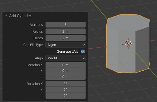 Set Vertices to 8 (or just a number considerably lower than 32). In Edit mode, move the cylinder up 1 meter. Press S Shift+Z to scale while constraining the Z axis. We’re trying to make a narrow pole for the rail supports.